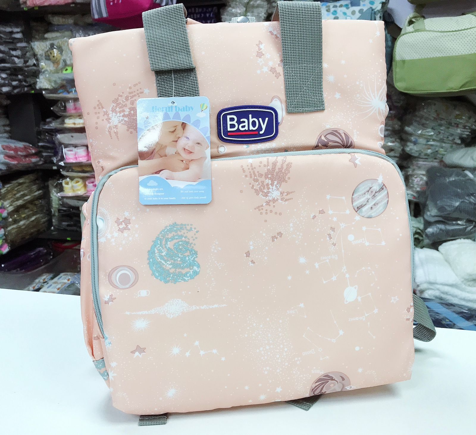 Mochila maternal en hermoso diseño estelar.